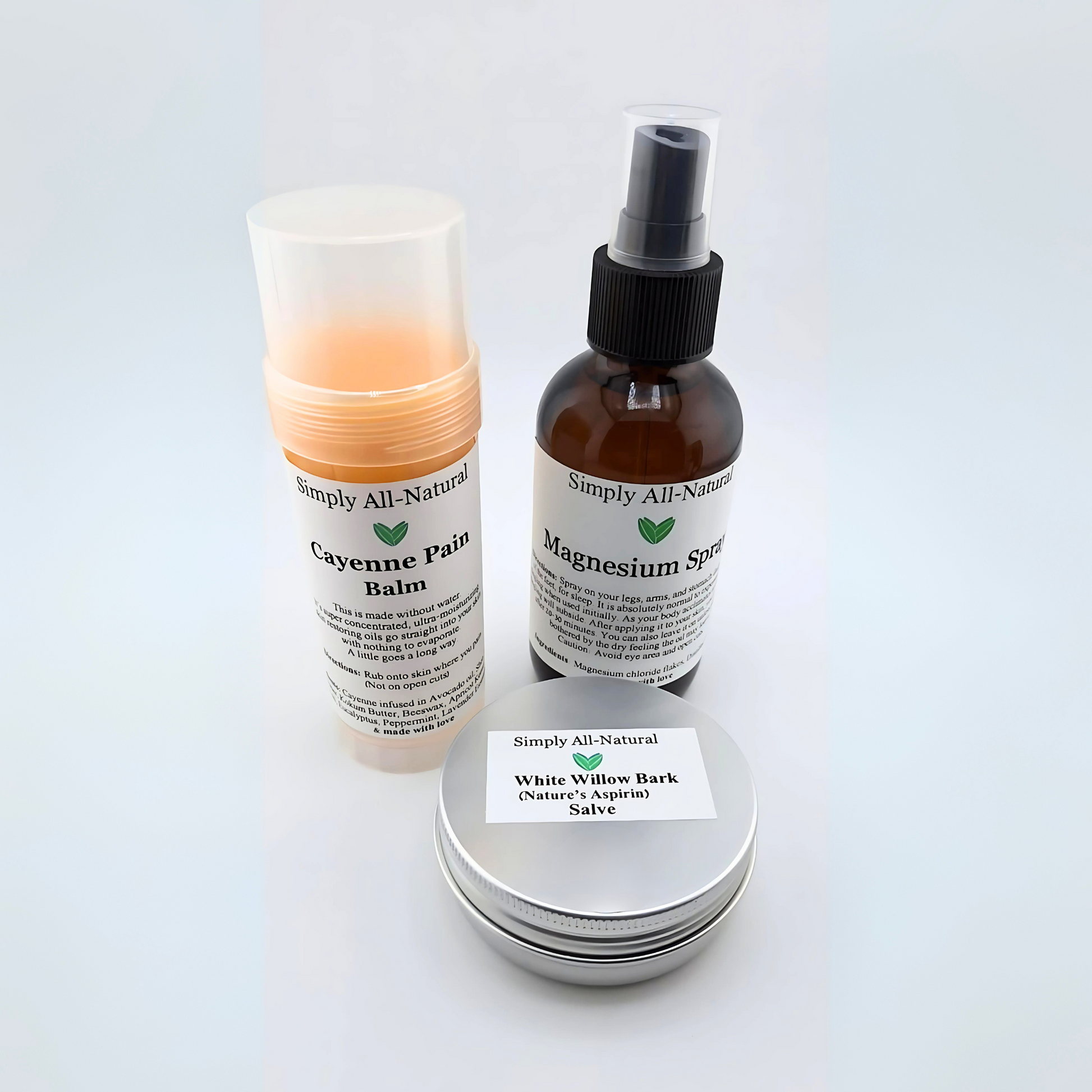 Soothe your body and ease discomfort with Simply All-Natural’s Pain Relief Bundle, a powerful trio designed to tackle muscle tension, joint pain, and inflammation naturally. This bundle includes our Magnesium Spray, Cayenne Pain Balm, and White Willow Bark Salve, each formulated with premium, all-natural ingredients to provide effective relief. Whether you're recovering from physical activity, managing chronic pain, or simply seeking relaxation, this bundle offers a holistic approach to pain management.